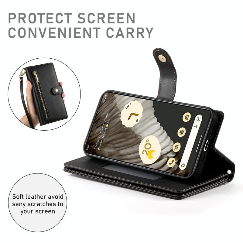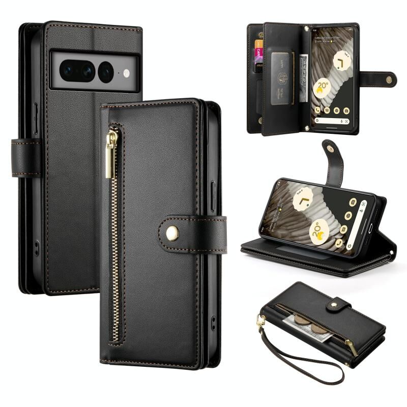 Για το Google Pixel 7 Pro Nine Card-slot φερμουάρ τσάντα πορτοφόλι δερμάτινη θήκη τηλεφώνου (μαύρο)