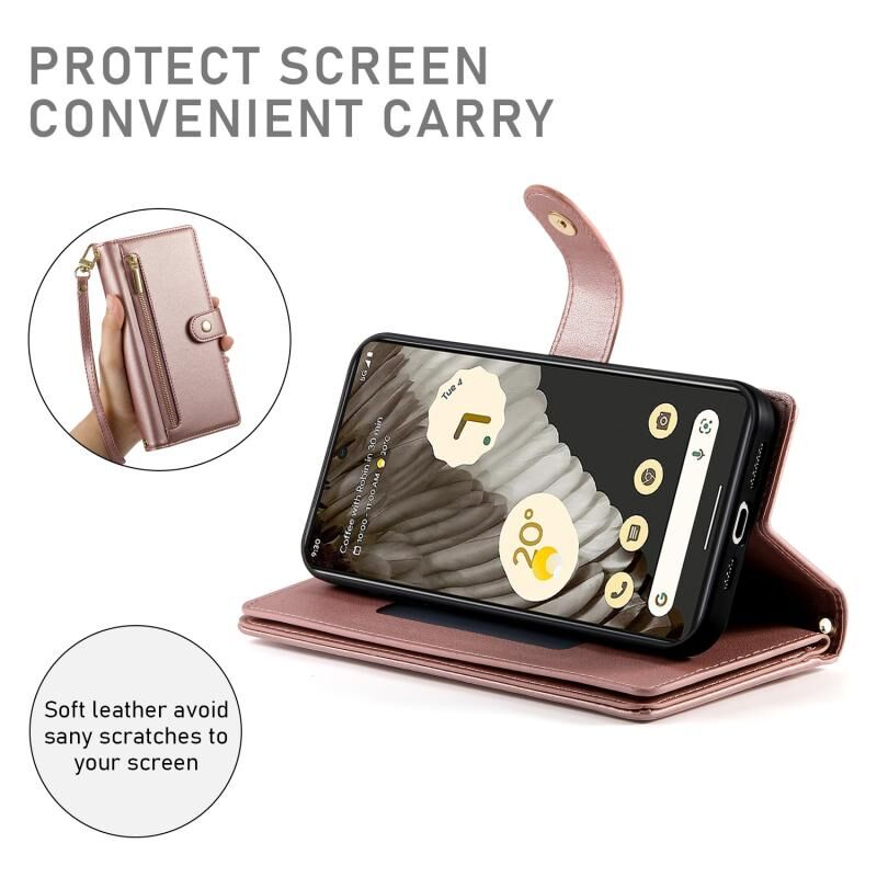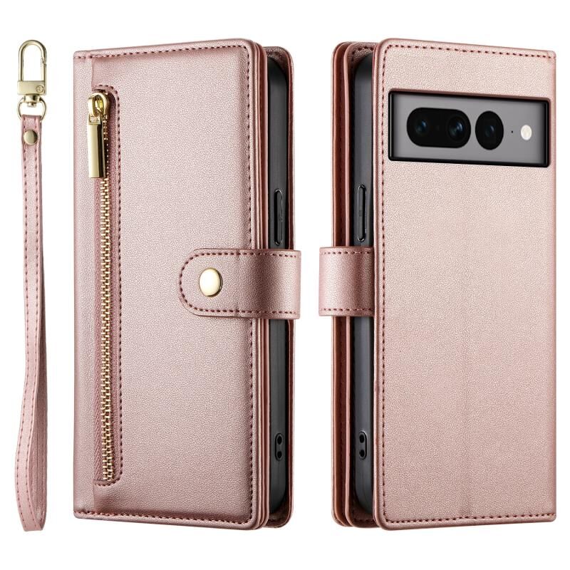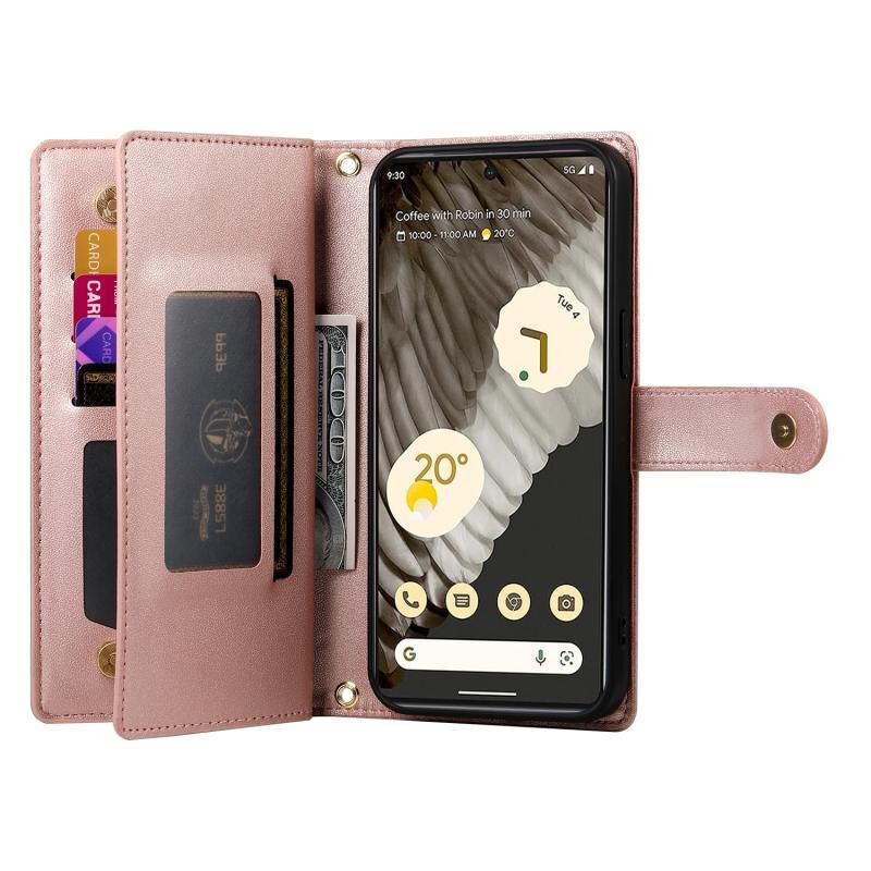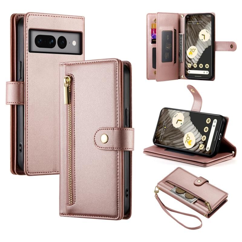 Για το Google Pixel 7 Pro Nine Card-slot φερμουάρ τσάντα πορτοφόλι δερμάτινη θήκη τηλεφώνου (ροζ)