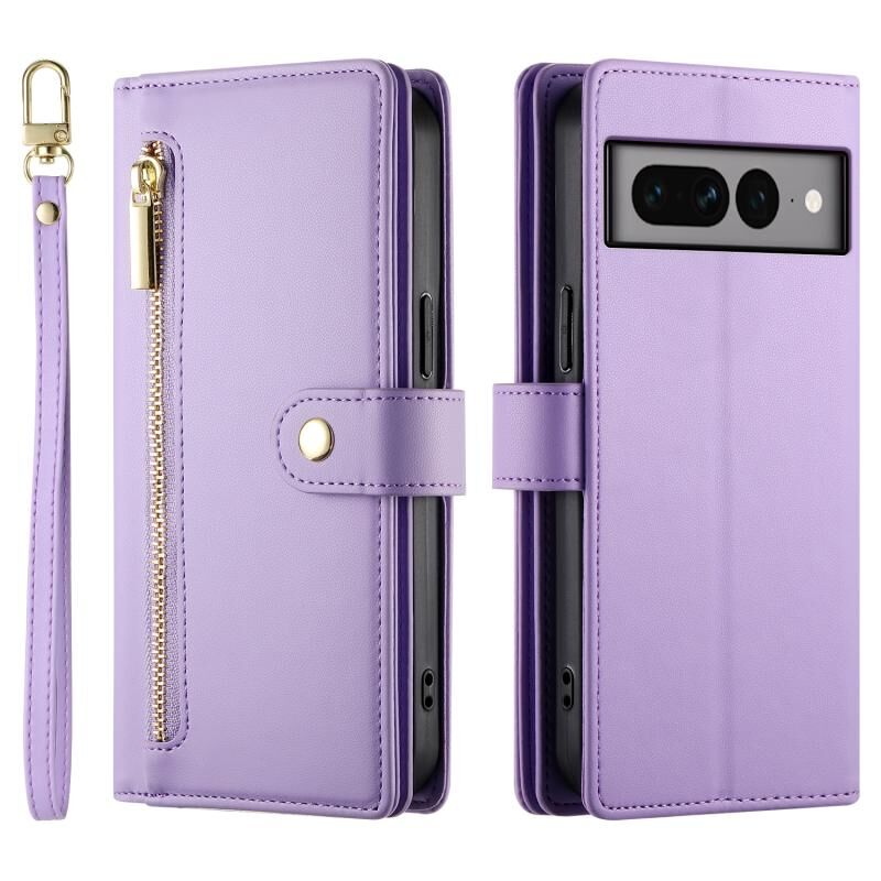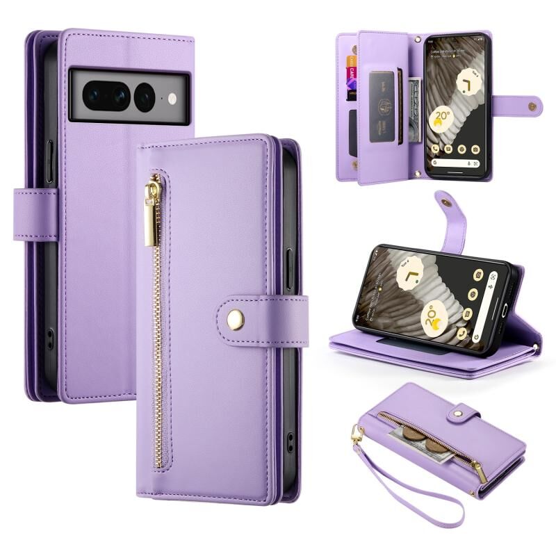 Για το Google Pixel 7 Pro Nine Card-slot φερμουάρ τσάντα πορτοφόλι δερμάτινη θήκη τηλεφώνου (μωβ)