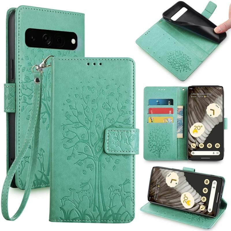 Για το Google Pixel 7 Pro δέντρο & ελάφι ανάγλυφη δερμάτινη θήκη τηλεφώνου (πράσινο)