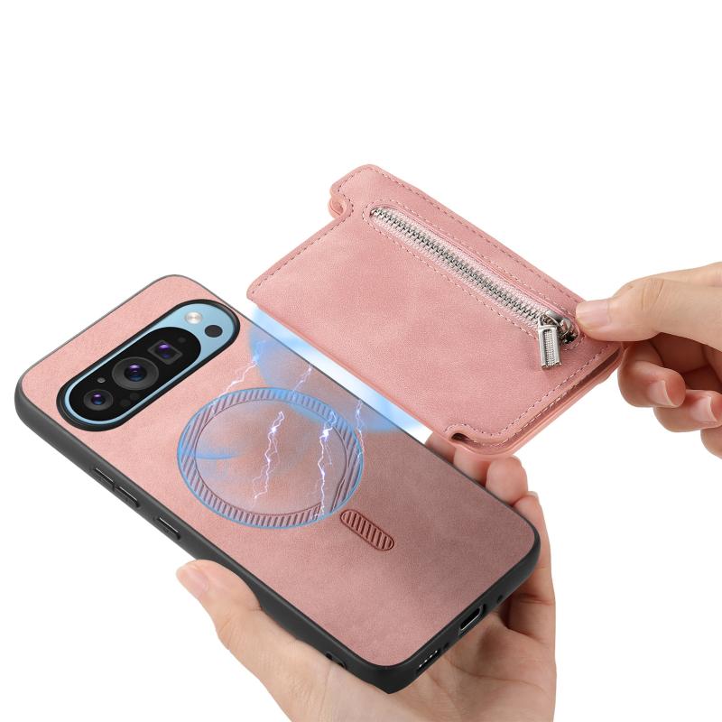 For Google Pixel 7 Retro MagSafe Zipper Wallet Card Bag Back Phone Case(Pink)