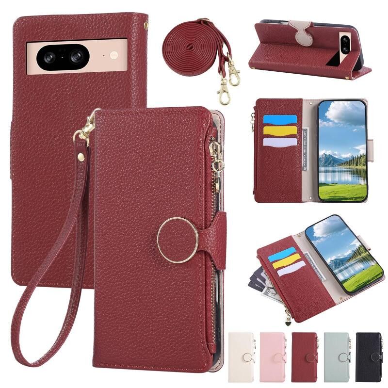 For Google Pixel 7 Round Buckle Zipper Wallet Leather Phone Case with Crossbody Strap(Red)
