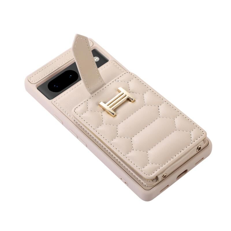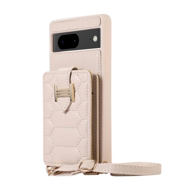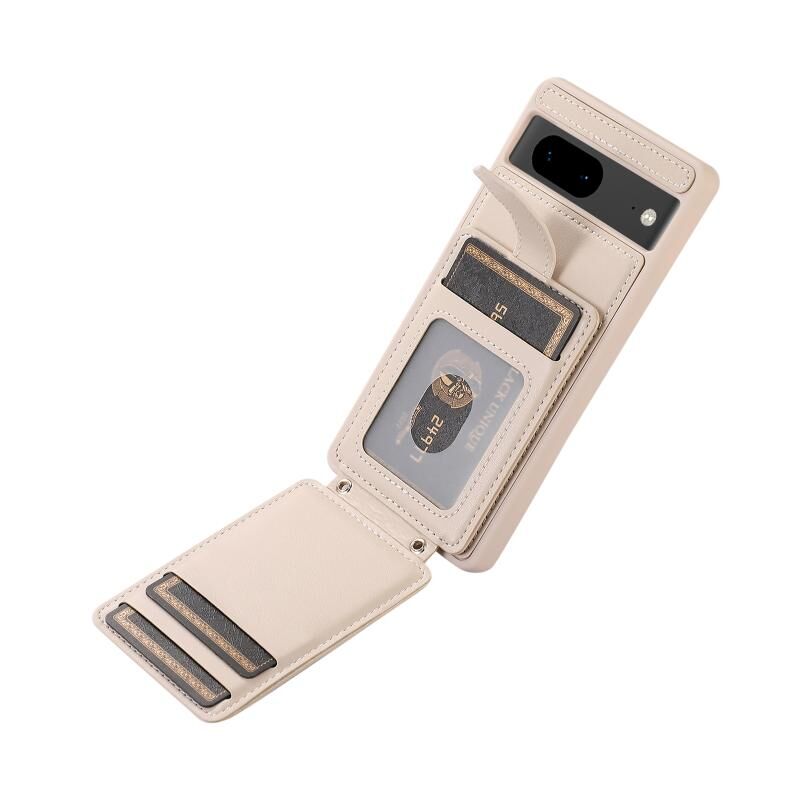 Για το Google Pixel 7 Κάθετη τσάντα κάρτας δαχτυλίδι κάτοχος υπόθεση τηλεφώνου με διπλό κορδόνι (μπεζ)