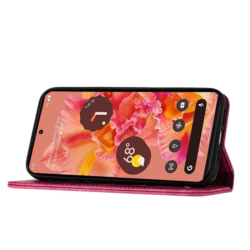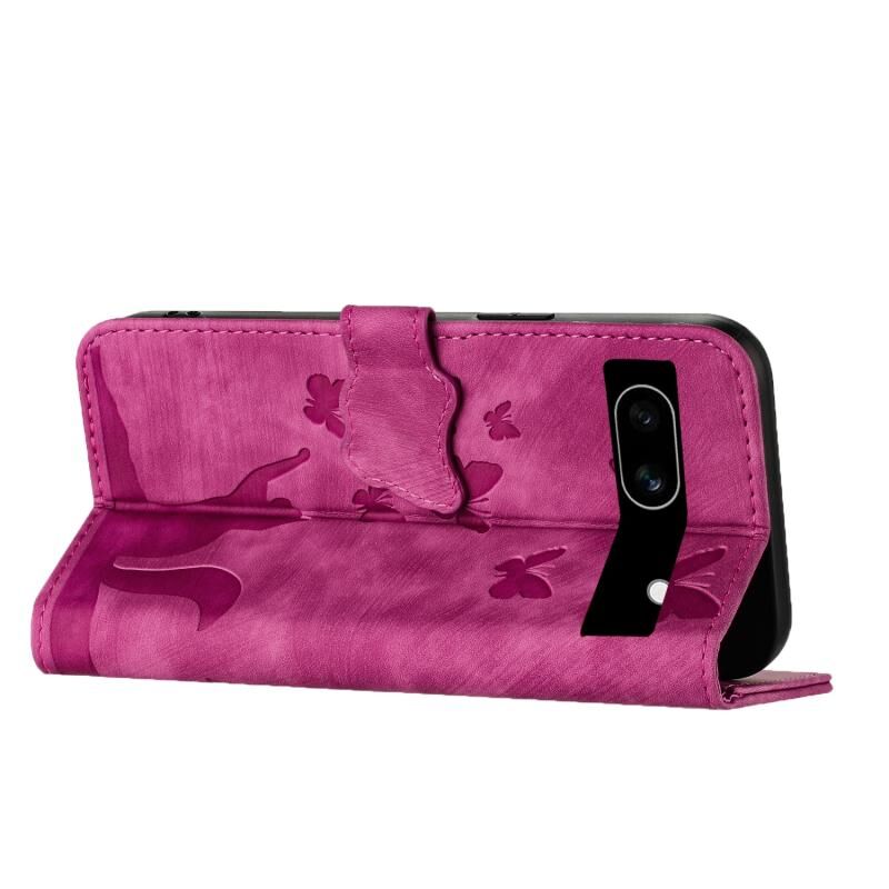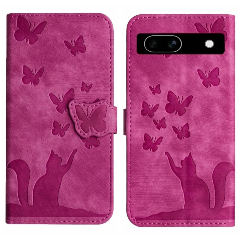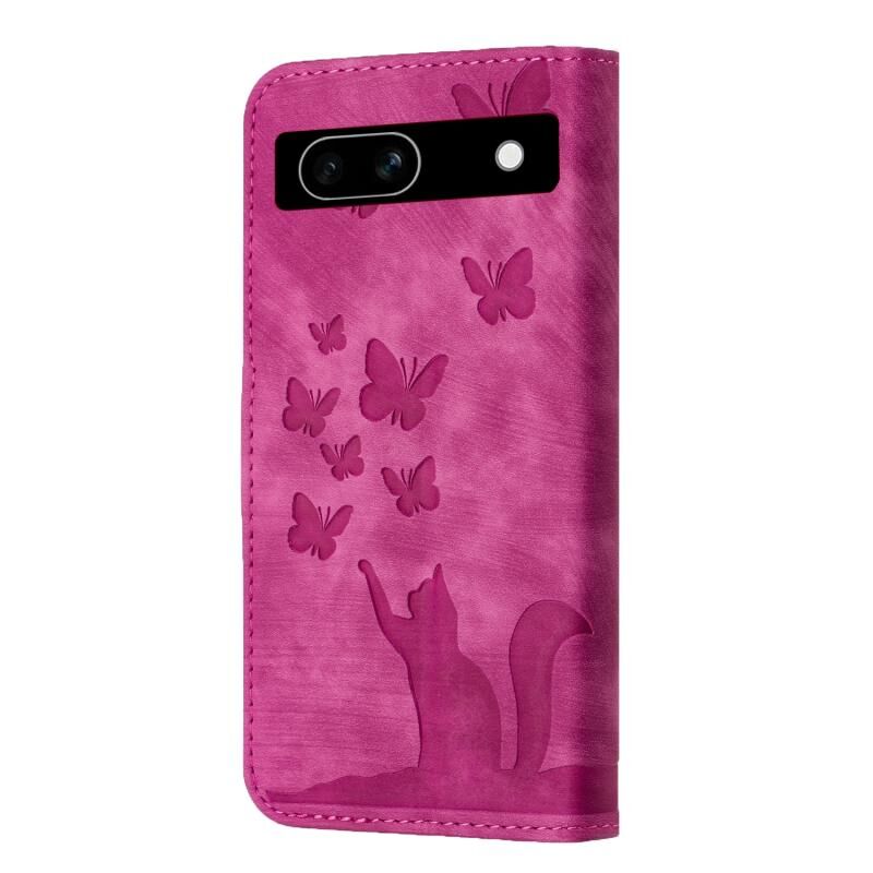 Θήκη τηλεφώνου από δέρμα με ανάγλυφο σχέδιο πεταλούδας και γάτας για Google Pixel 7a (Μωβ)