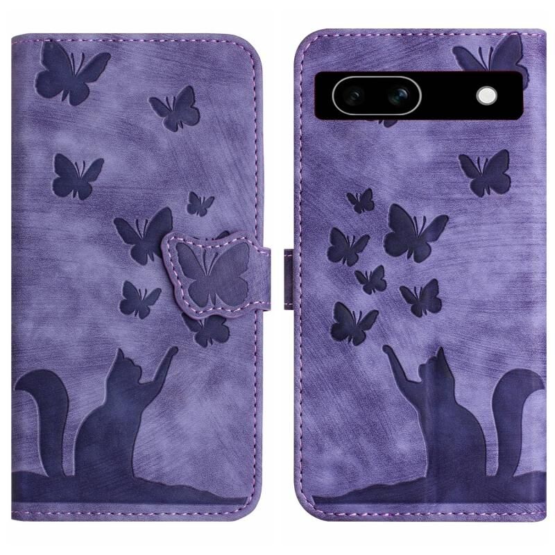Θήκη τηλεφώνου από δέρμα με ανάγλυφο σχέδιο πεταλούδας και γάτας για Google Pixel 7a (Μωβ)