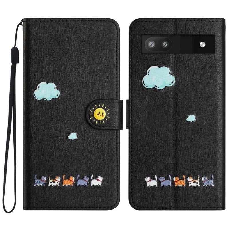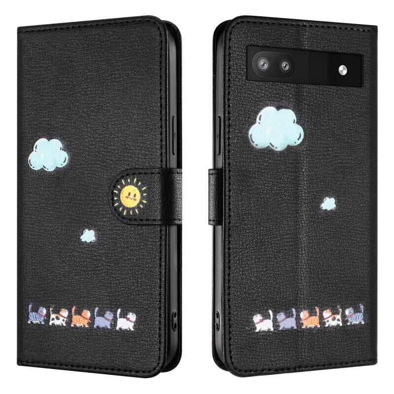 For Google Pixel 7a Cartoon Cats Leather Phone Case(Black)