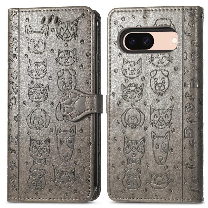 For Google Pixel 7a Cat and Dog Embossed Leather Phone Case(Gray)