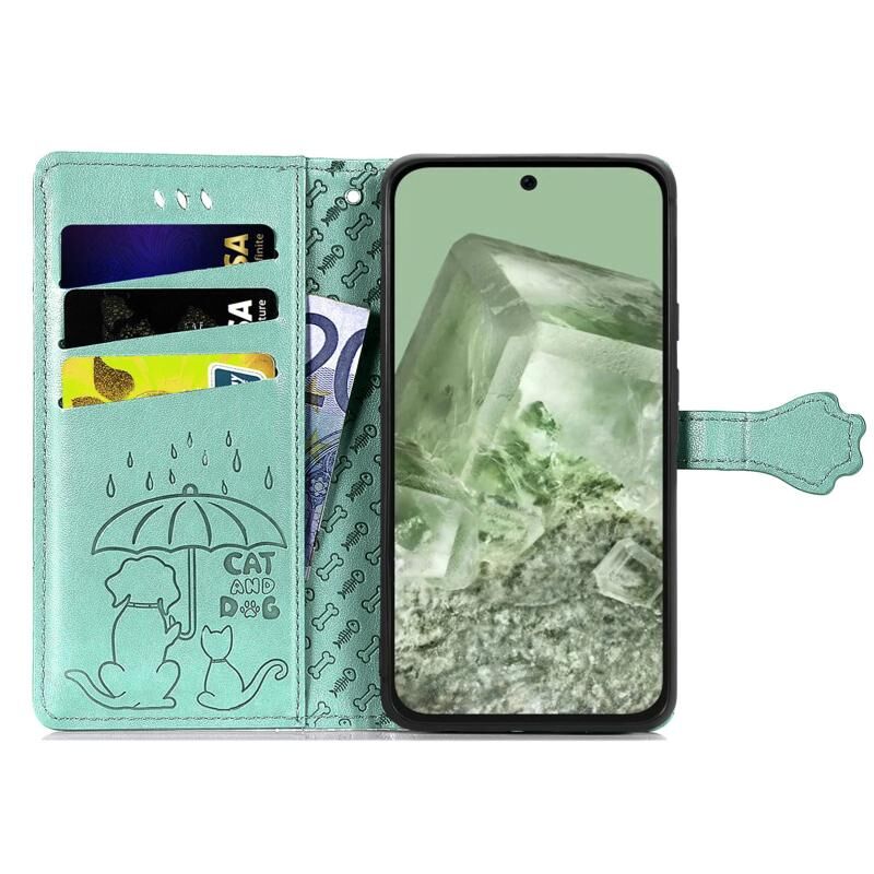 For Google Pixel 7a Cat and Dog Embossed Leather Phone Case(Green)
