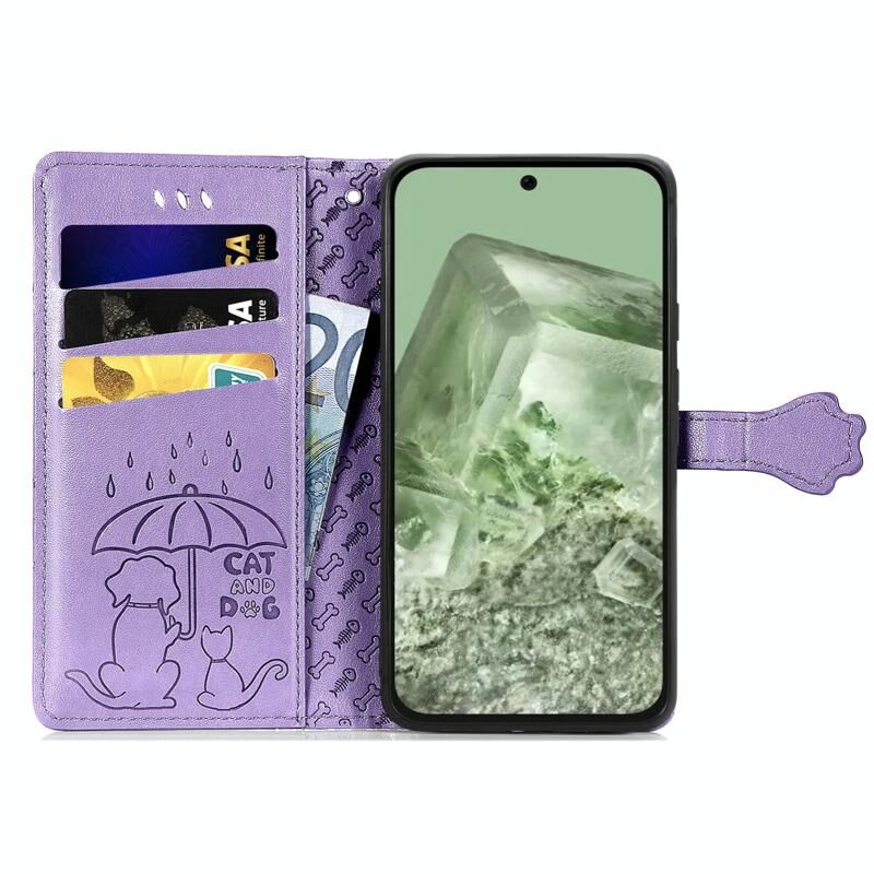For Google Pixel 7a Cat and Dog Embossed Leather Phone Case(Purple)