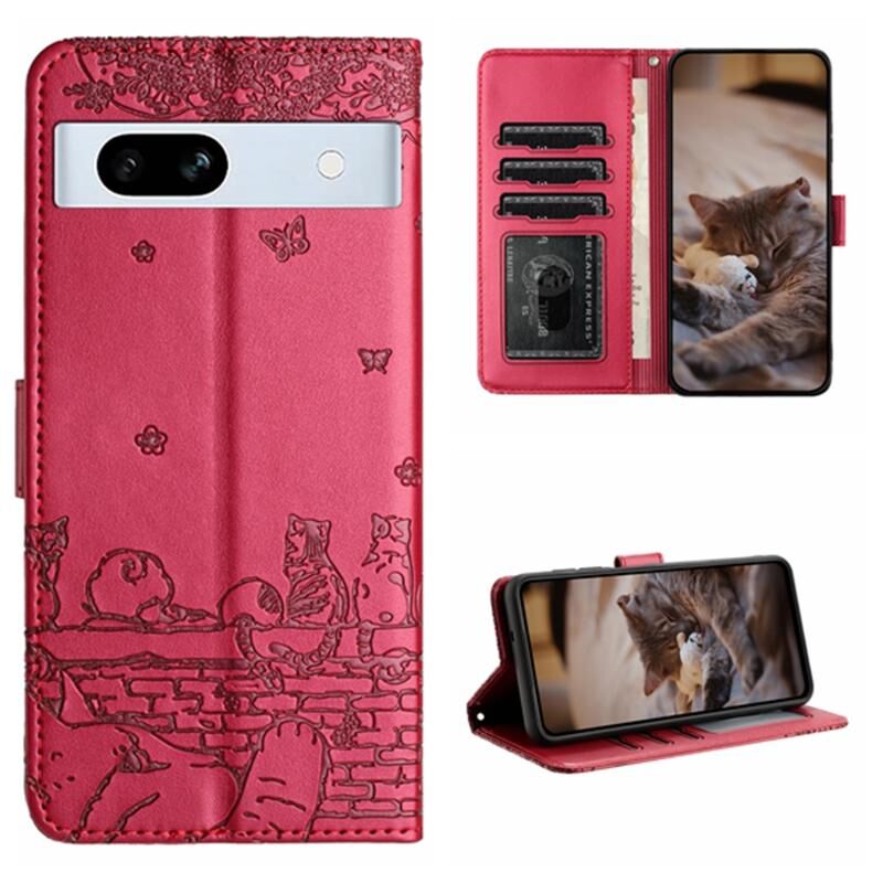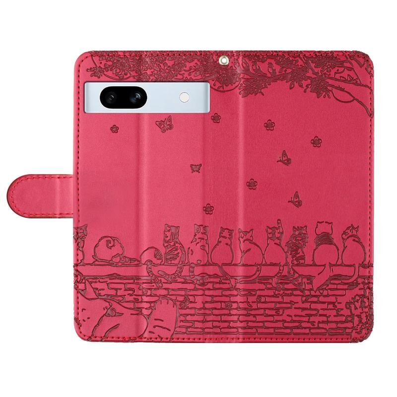 For Google Pixel 7a Cat Embossing Pattern Leather Phone Case with Lanyard(Red)