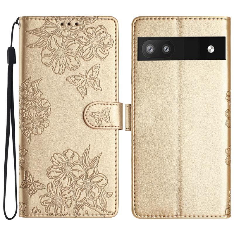 For Google Pixel 7a Cherry Blossom Butterfly Skin Feel Embossed PU Phone Case(Gold)