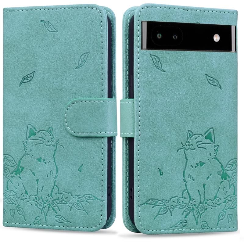 Θήκη τηλεφώνου από δέρμα με ανάγλυφο χαριτωμένο γατάκι για Google Pixel 7a (Πράσινο)