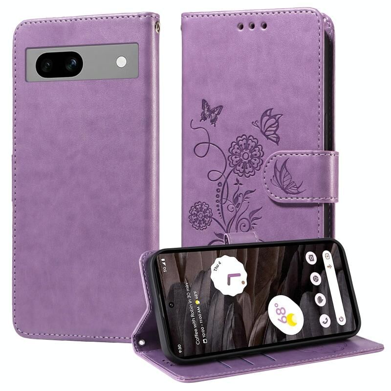 Θήκη τηλεφώνου από δέρμα με ανάγλυφα σχέδια πεταλούδας και λουλουδιών για Google Pixel 7a (Μωβ)