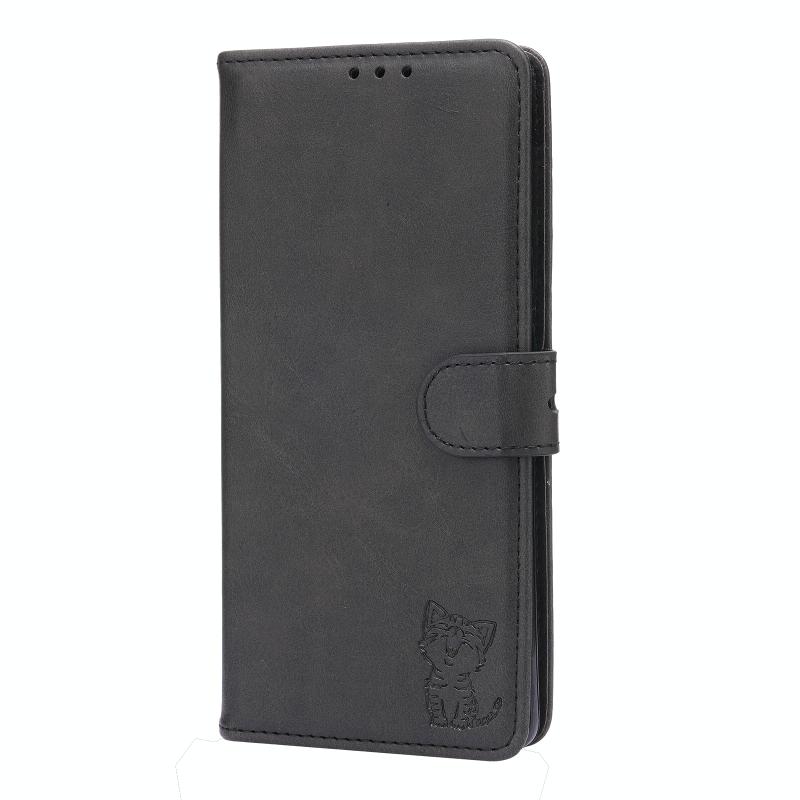 Θήκη τηλεφώνου από δέρμα με σχέδιο χαρούμενης γάτας σε ανάγλυφο για Google Pixel 7a (Γκρι)