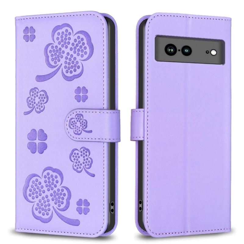 Για το Google Pixel 7a τετράφυλλο ανάγλυφη δερμάτινη θήκη τηλεφώνου (μωβ)