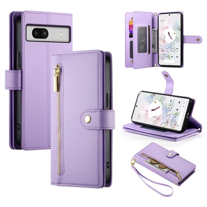 Για το Google Pixel 7a Nine Card-slot φερμουάρ πορτοφόλι τσάντα δερμάτινη θήκη τηλεφώνου (μωβ)