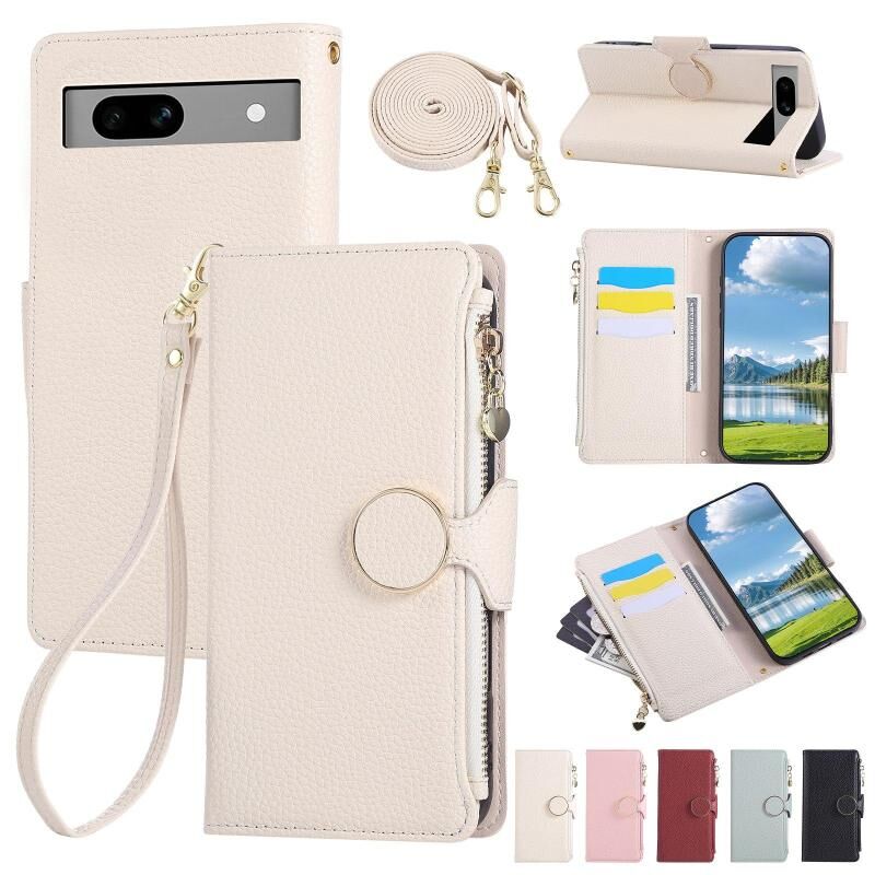 For Google Pixel 7a Round Buckle Zipper Wallet Leather Phone Case with Crossbody Strap(White)