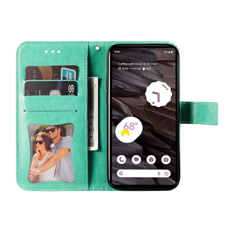 Θήκη τηλεφώνου από δέρμα με ανάγλυφα επτάφυλλα λουλούδια για Google Pixel 7a (Πράσινο)
