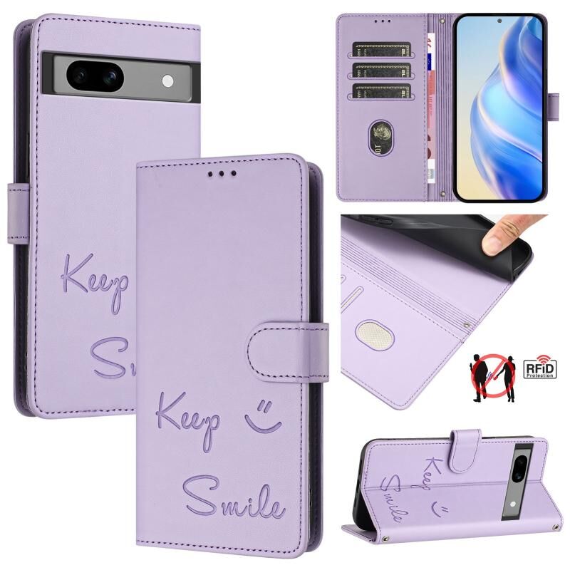 Για Google Pixel 7a Χαμόγελο ανάγλυφο RFID δερμάτινη θήκη τηλεφώνου (Light Purple)