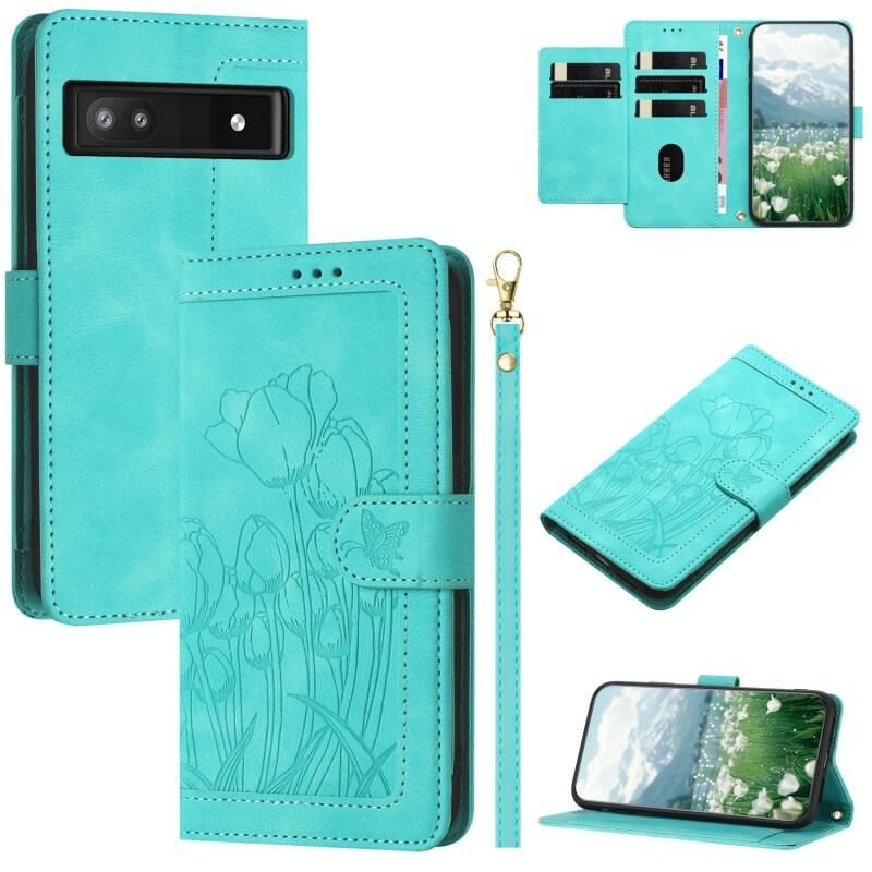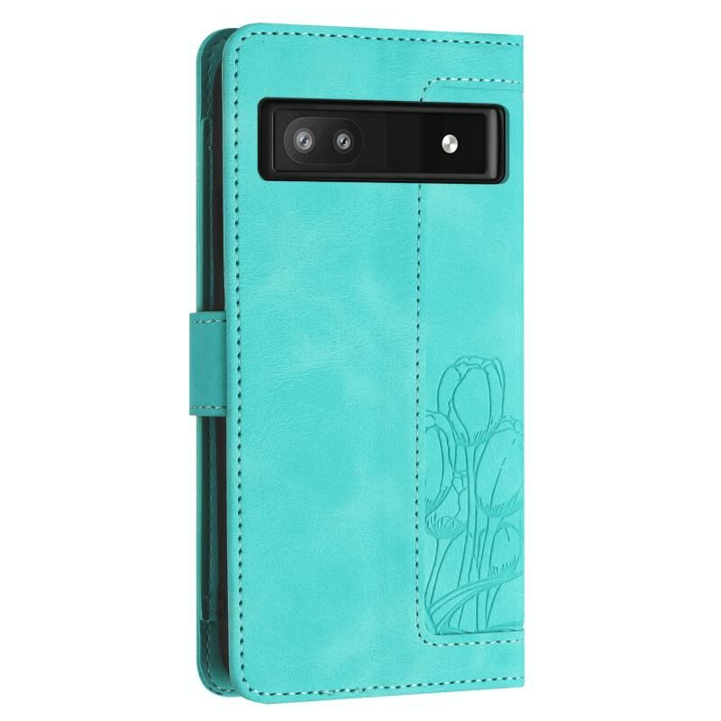 Θήκη τηλεφώνου από δέρμα με ανάγλυφα τουλίπες για Google Pixel 7a με κορδόνι (Ροζ)