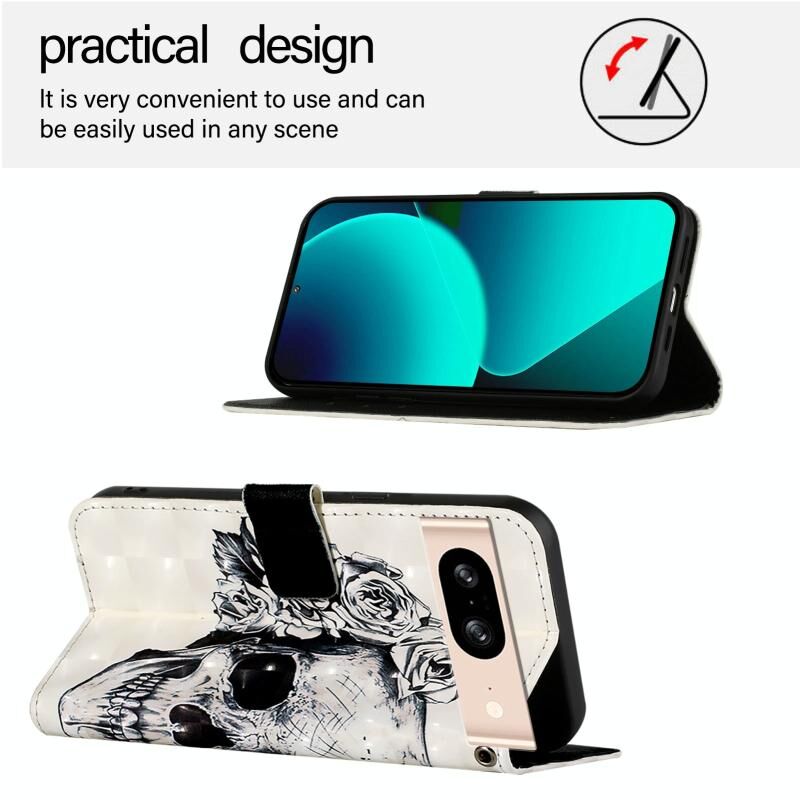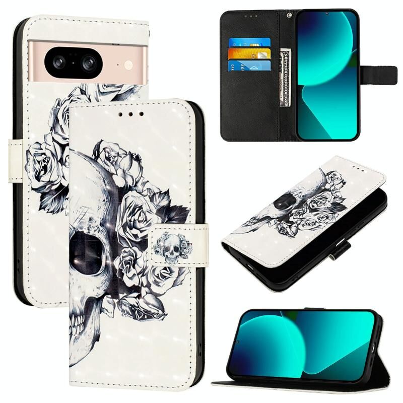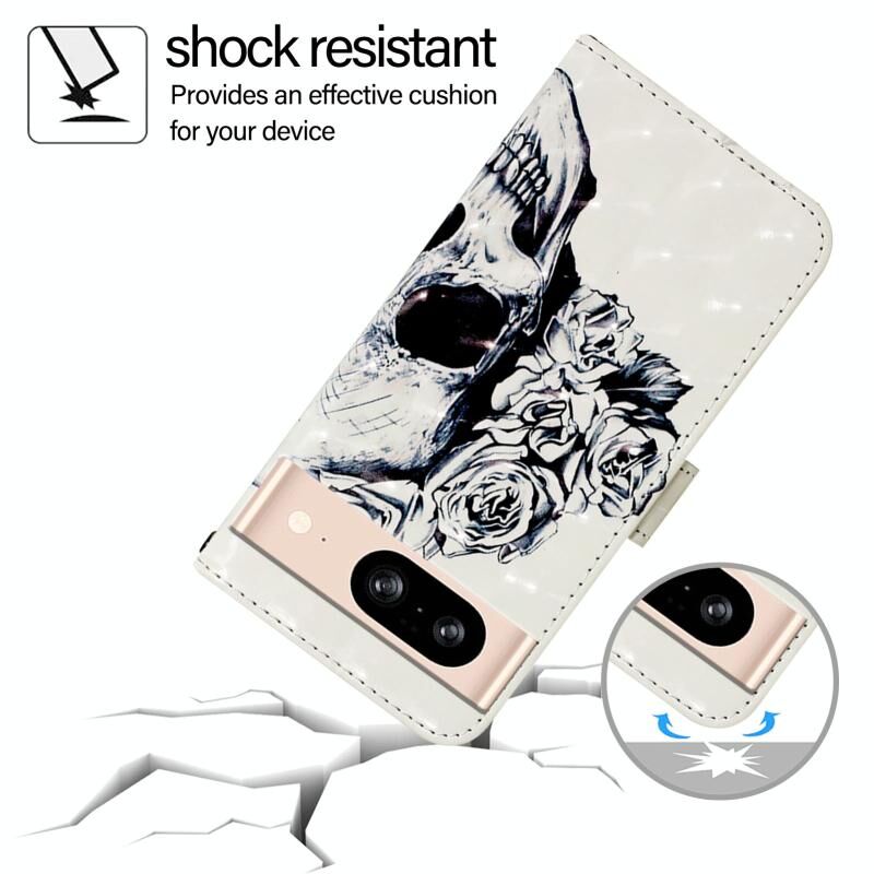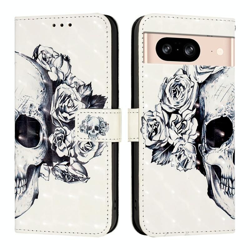 Θήκη τηλεφώνου από δέρμα με οριζόντια αναδίπλωση και τρισδιάστατη ζωγραφική για Google Pixel 8 (Κρανίο)