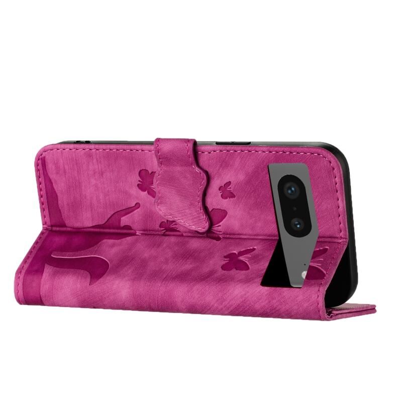 Θήκη τηλεφώνου από δέρμα με ανάγλυφο σχέδιο πεταλούδας και γάτας για Google Pixel 8 (Κόκκινο)