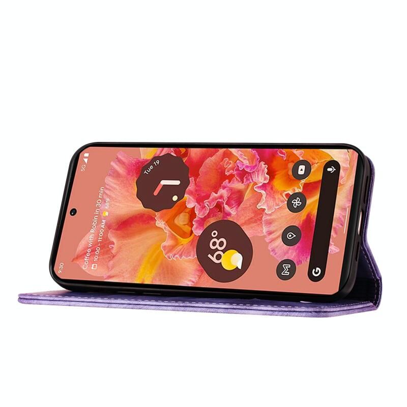Θήκη τηλεφώνου από δέρμα με ανάγλυφο σχέδιο πεταλούδας και γάτας για Google Pixel 8 (Μωβ)
