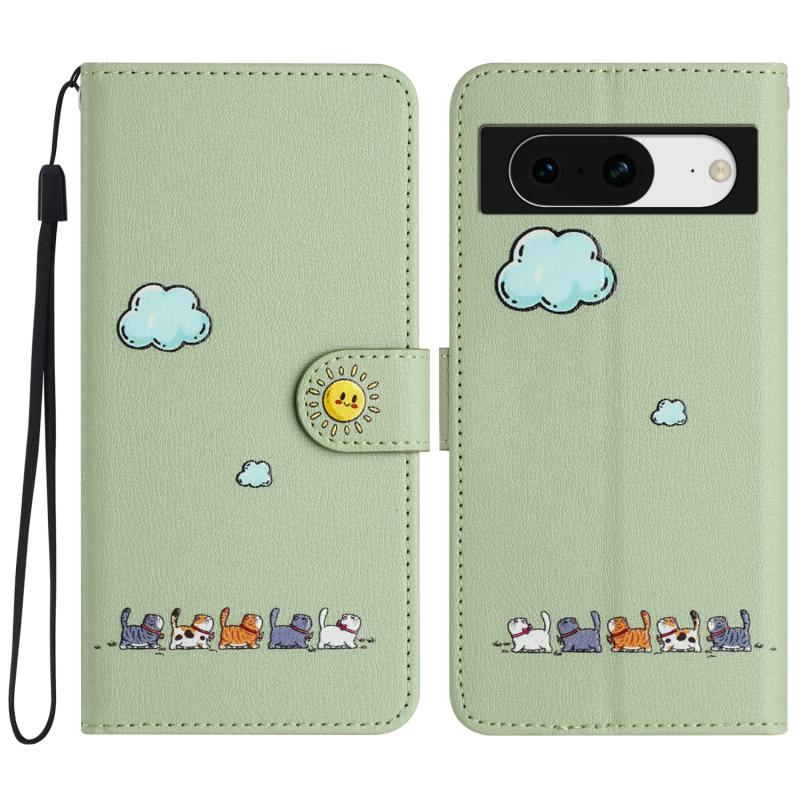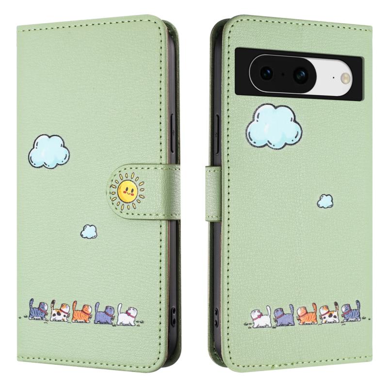 For Google Pixel 8 Cartoon Cats Leather Phone Case(Green)