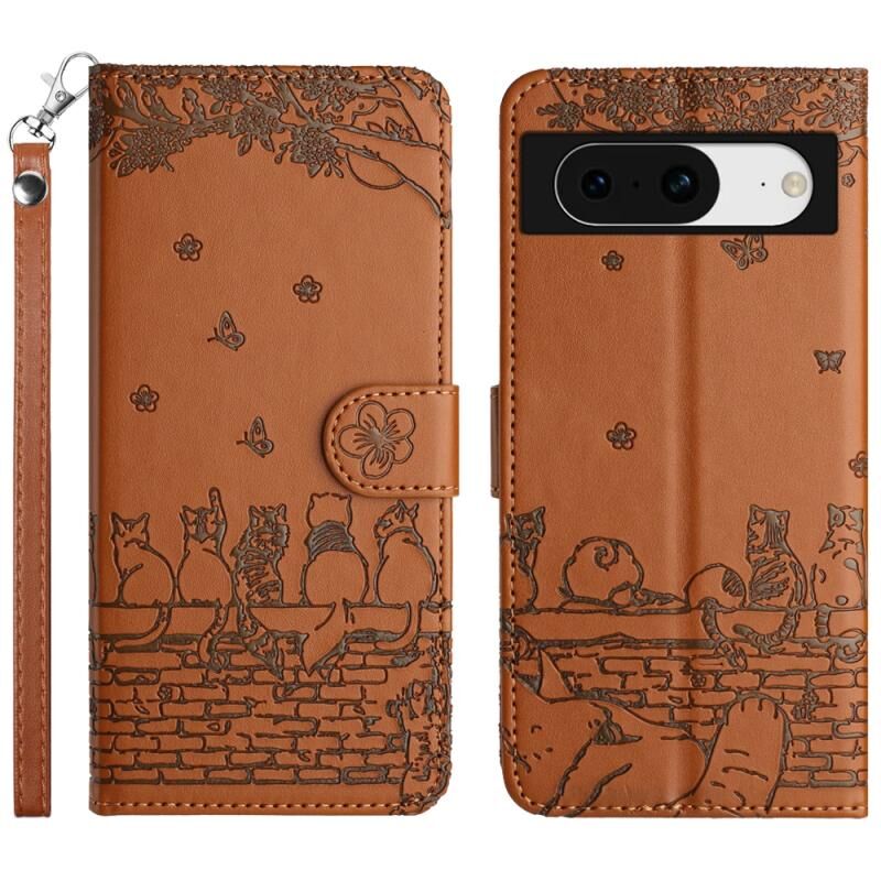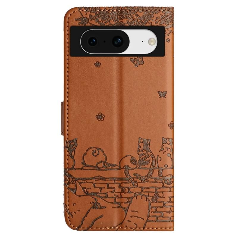 For Google Pixel 8 Cat Embossing Pattern Leather Phone Case with Lanyard(Brown)