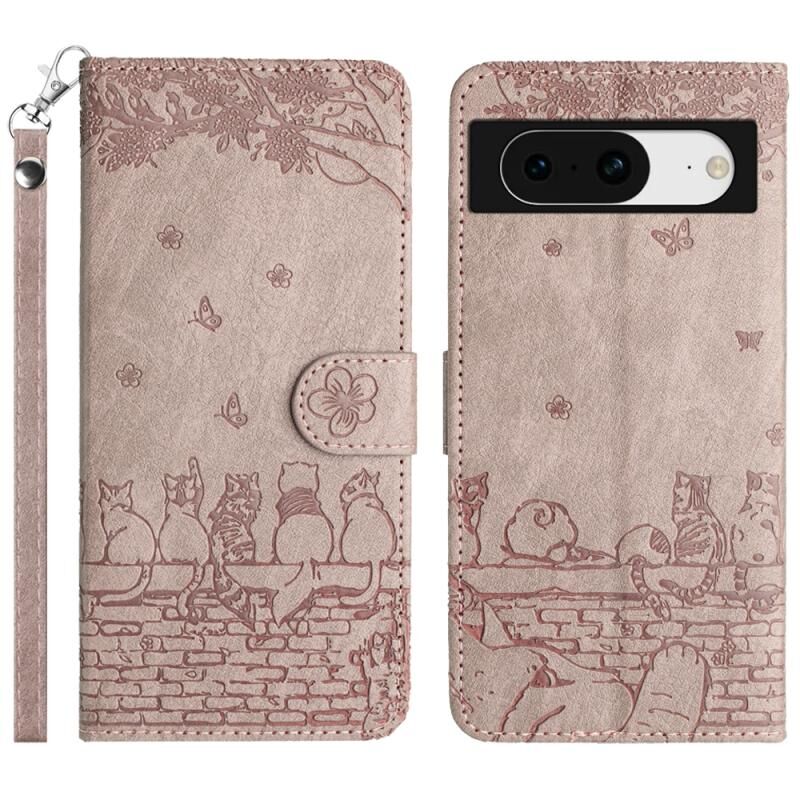 For Google Pixel 8 Cat Embossing Pattern Leather Phone Case with Lanyard(Grey)