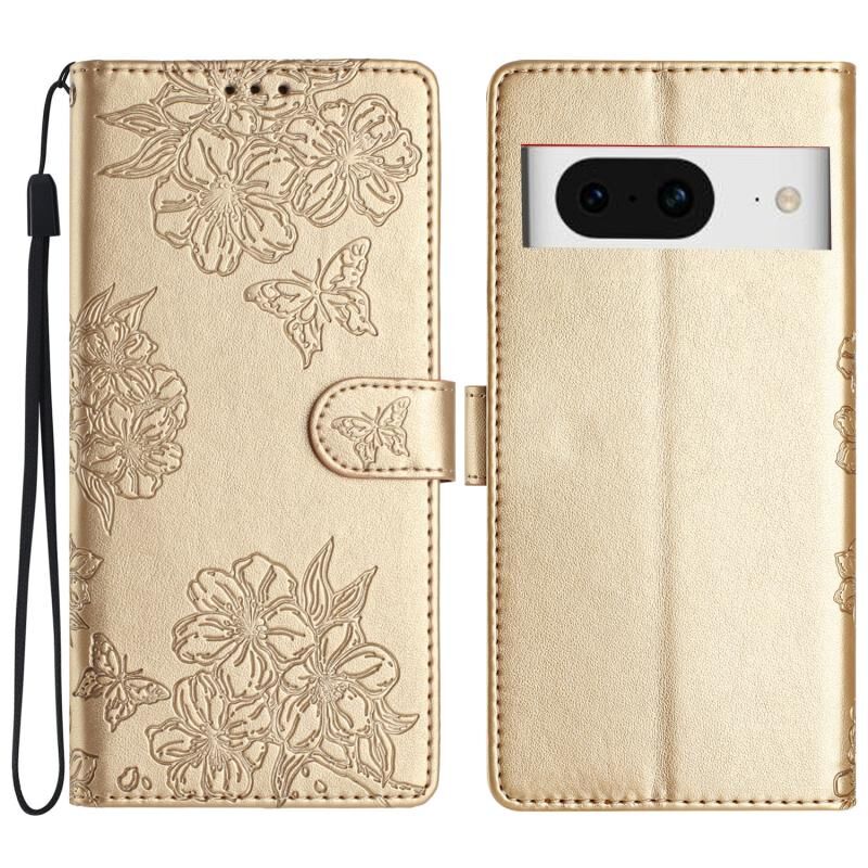 For Google Pixel 8 Cherry Blossom Butterfly Skin Feel Embossed PU Phone Case(Gold)