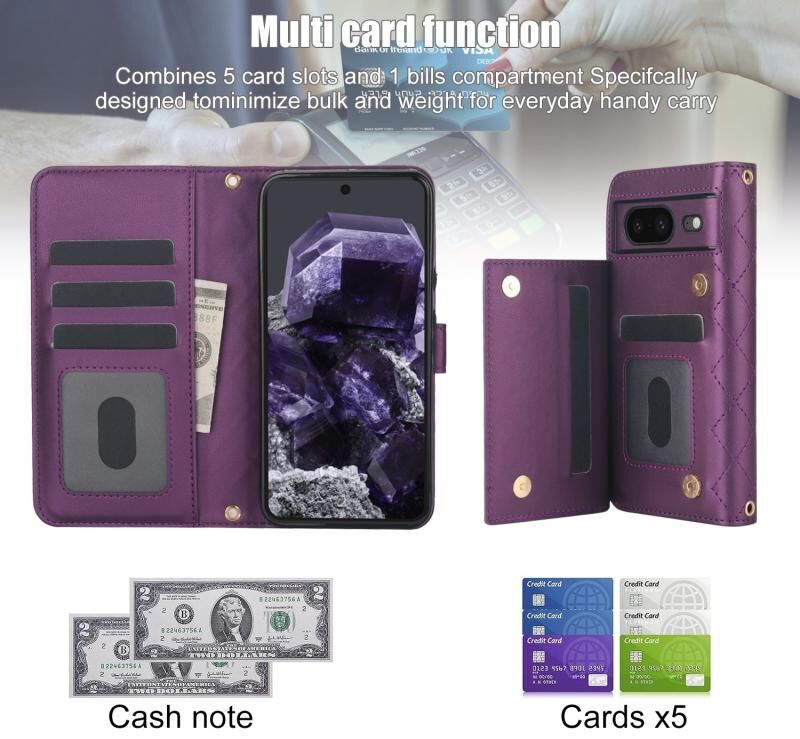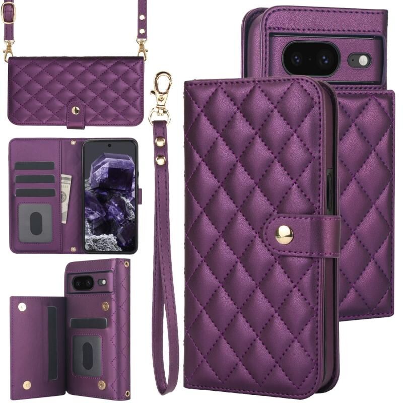 Για το Google Pixel 8 Crossbody Πολυλειτουργική θήκη τηλεφώνου από ρομβοειδές δέρμα (σκούρο μοβ)