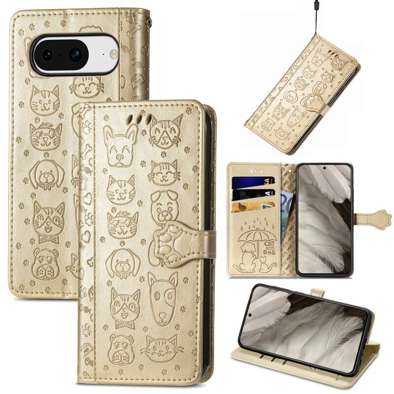 Θήκη τηλεφώνου από δέρμα με ανάγλυφα σχέδια χαριτωμένων γάτας και σκύλου για Google Pixel 8 (Μπλε)