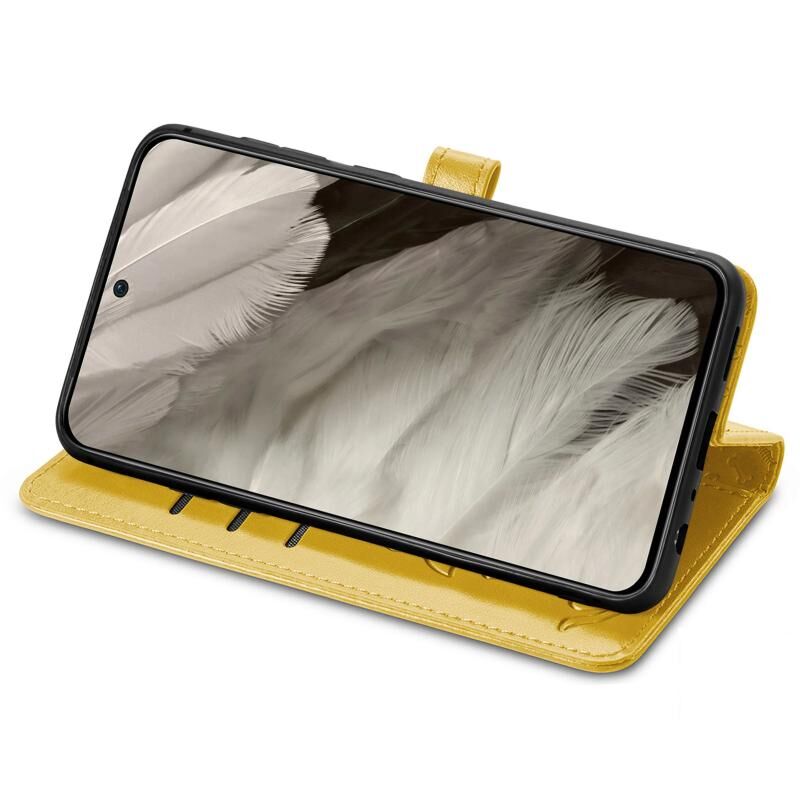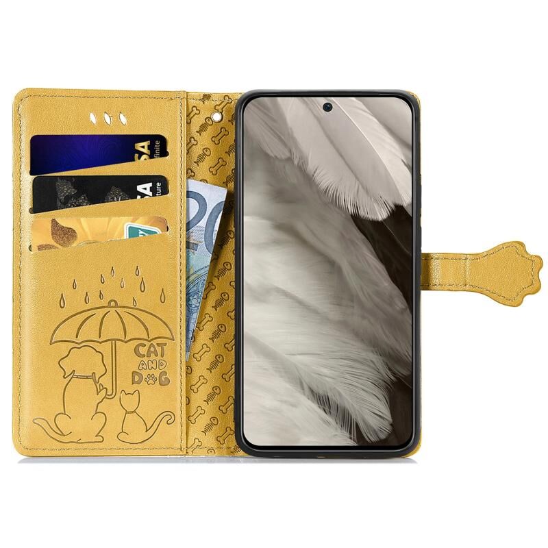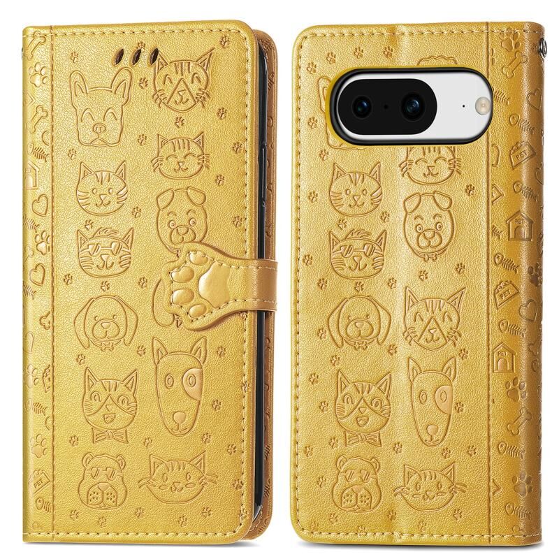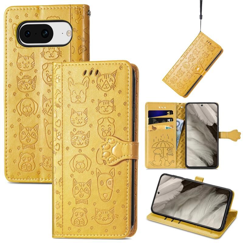 Θήκη τηλεφώνου από δέρμα με ανάγλυφα σχέδια χαριτωμένων γάτας και σκύλου για Google Pixel 8 (Μπλε)