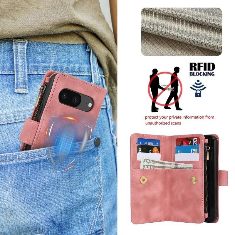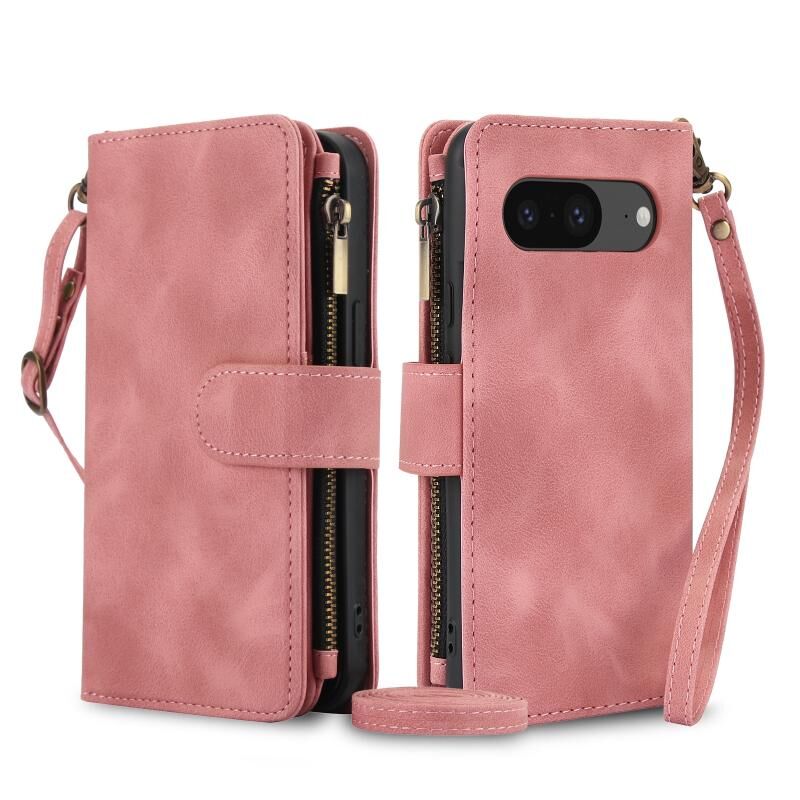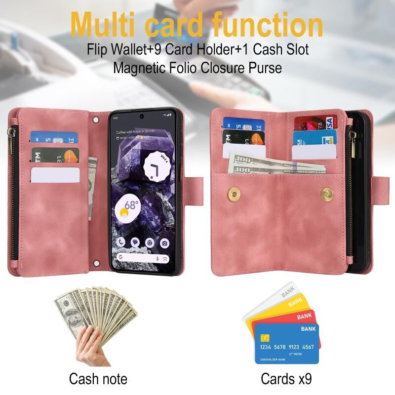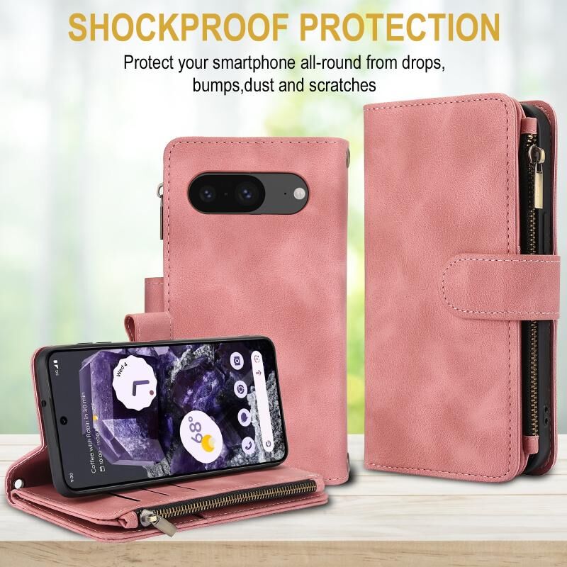 Για Google Pixel 8 Dream 9-Card φερμουάρ πορτοφόλι RFID δερμάτινη θήκη τηλεφώνου με κορδόνι (ροζ χρυσό)