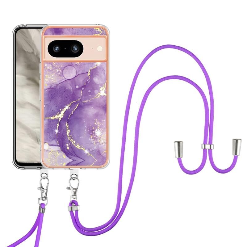 For Google Pixel 8 Electroplating Marble Dual-side IMD Phone Case with Lanyard(Purple 002)