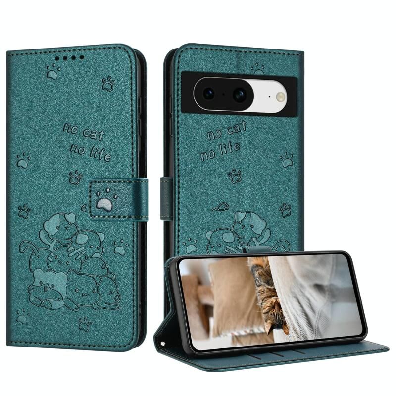 Θήκη δερμάτινη για Google Pixel 8 με ανάγλυφο γατάκι και κορδόνι (Μωβ)