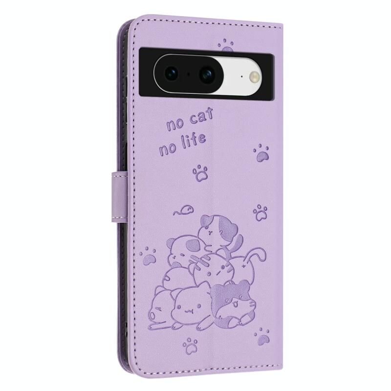Θήκη δερμάτινη για Google Pixel 8 με ανάγλυφο γατάκι και κορδόνι (Μωβ)