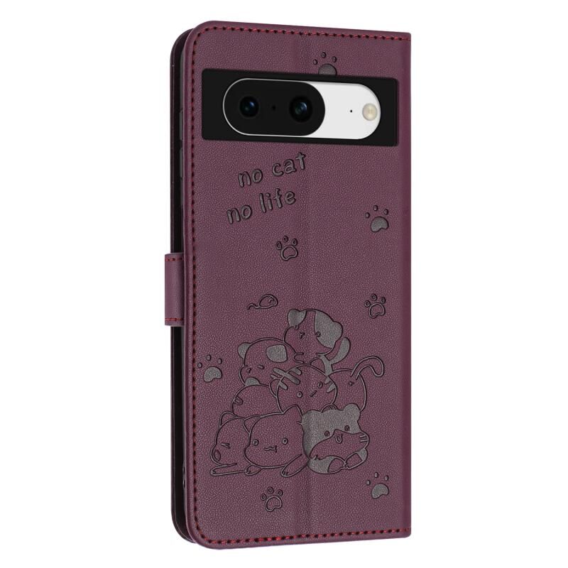 Θήκη δερμάτινη για Google Pixel 8 με ανάγλυφο γατάκι και κορδόνι (Μωβ)