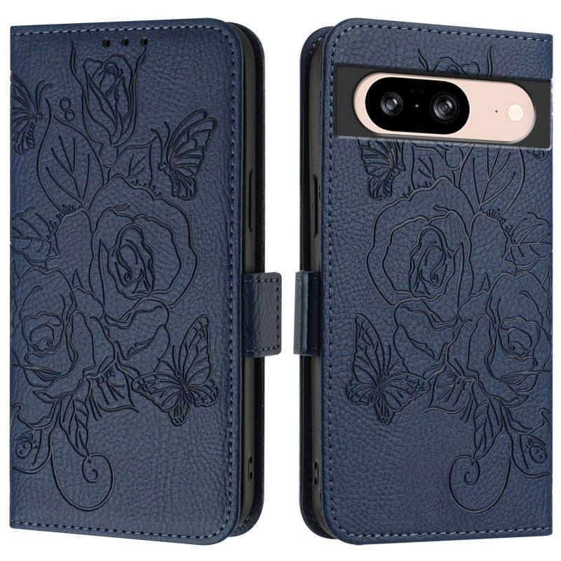For Google Pixel 8 Embossed Rose RFID Anti-theft Leather Phone Case(Dark Blue)