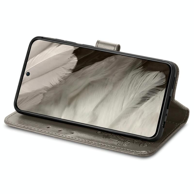 Θήκη τηλεφώνου από δέρμα με ανάγλυφο σχέδιο και κούμπωμα τριφυλλιού για Google Pixel 8 (Χρυσό Ρόδι)