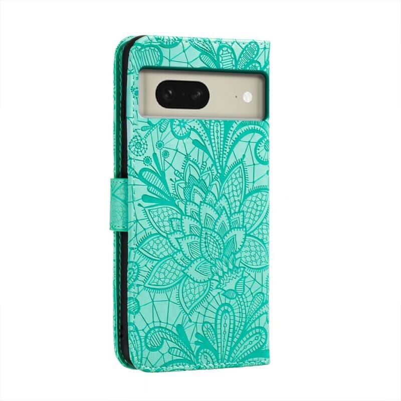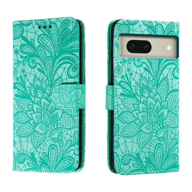 Για το Google Pixel 8 Lace λουλούδι ανάγλυφο Flip υπόθεση τηλεφώνου δέρμα (πράσινο)