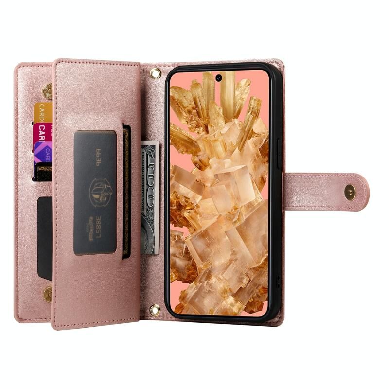 Για το Google Pixel 8 Nine Card-slot φερμουάρ τσάντα πορτοφόλι δερμάτινη θήκη τηλεφώνου (ροζ)
