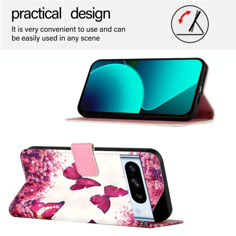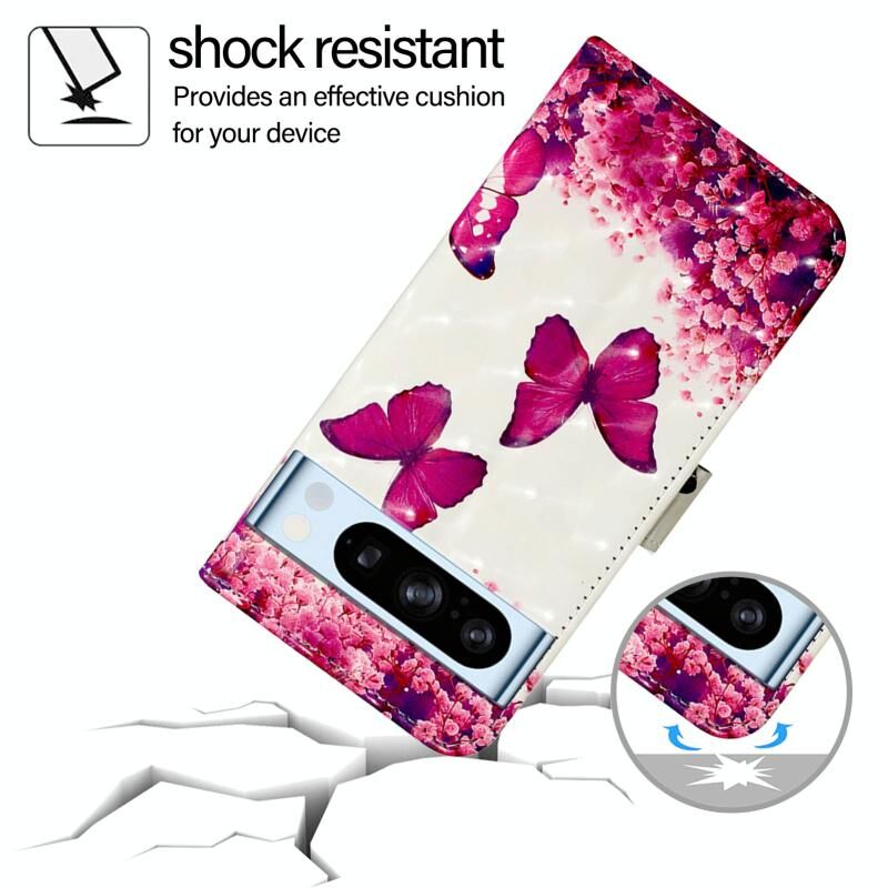 Θήκη τηλεφώνου από δέρμα με οριζόντια αναδίπλωση και τρισδιάστατη ζωγραφική για Google Pixel 8 Pro (Ροζ Πεταλούδα)