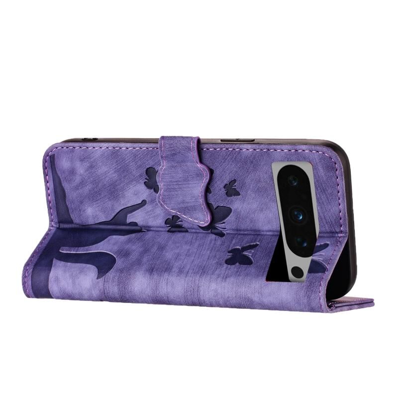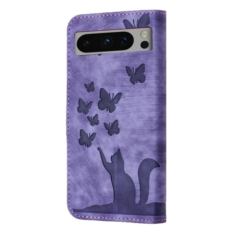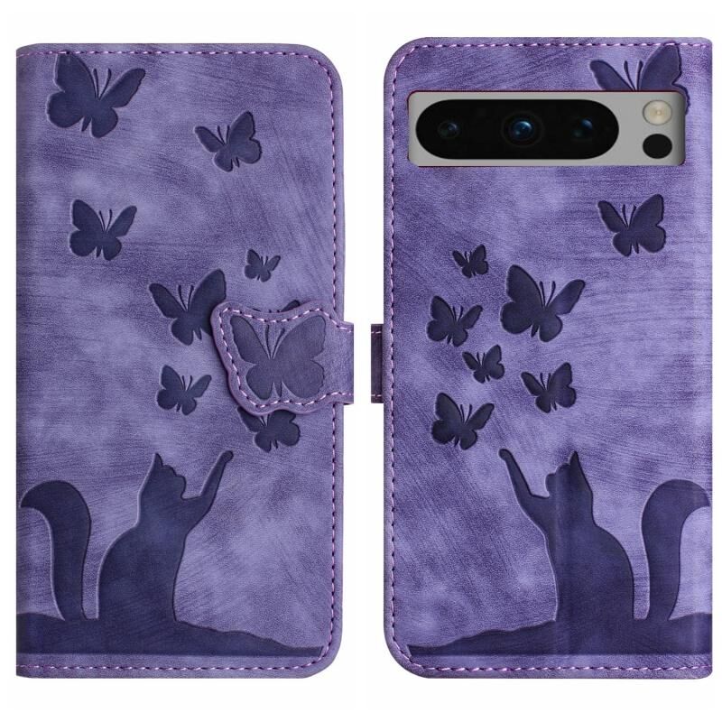 Θήκη τηλεφώνου από δέρμα με ανάγλυφο σχέδιο πεταλούδας και γάτας για Google Pixel 8 Pro (Μωβ)