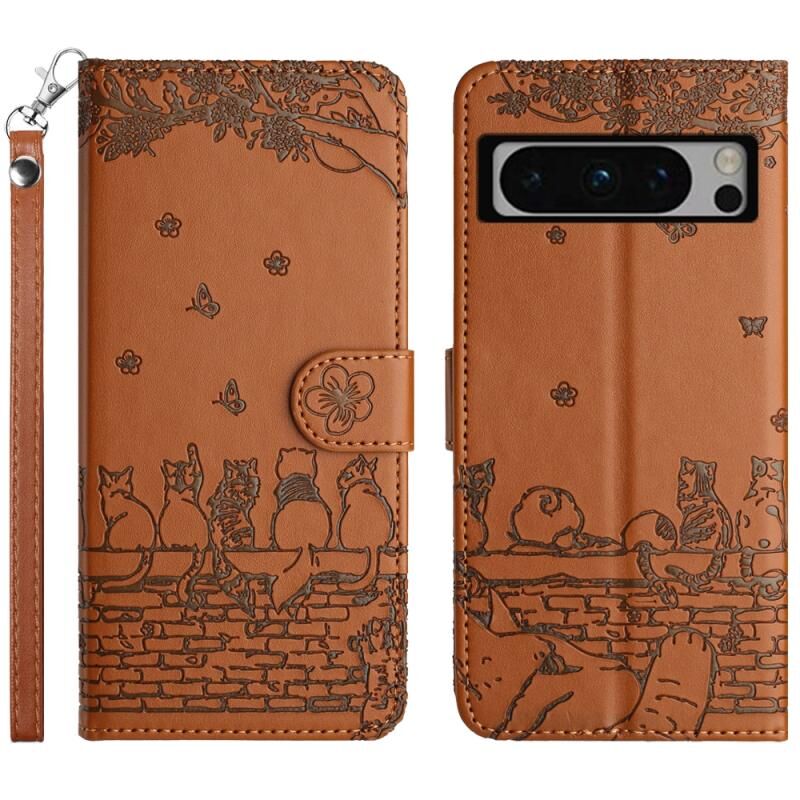 For Google Pixel 8 Pro Cat Embossing Pattern Leather Phone Case with Lanyard(Brown)