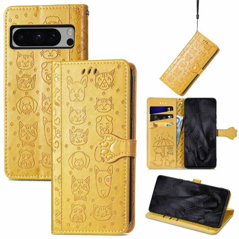 Θήκη τηλεφώνου από δέρμα με ανάγλυφα σχέδια χαριτωμένων γάτας και σκύλου για Google Pixel 8 Pro (Μπλε)