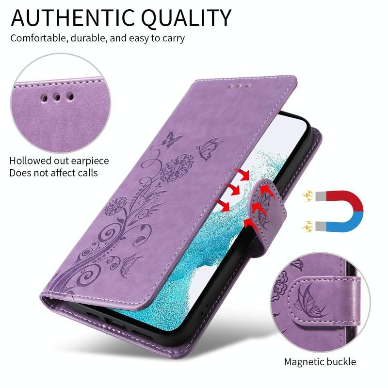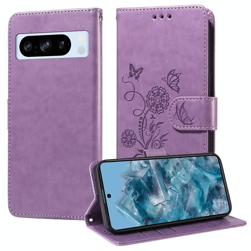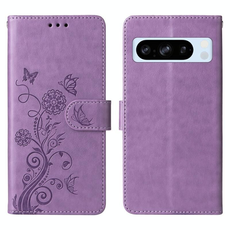 Θήκη τηλεφώνου από δέρμα με ανάγλυφα σχέδια πεταλούδας και λουλουδιών για Google Pixel 8 Pro (Μωβ)