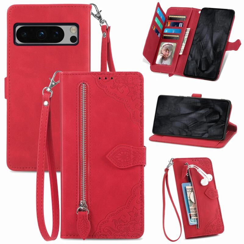 Για το Google Pixel 8 Pro ανάγλυφο λουλούδι φερμουάρ δερμάτινη θήκη τηλεφώνου (κόκκινο)