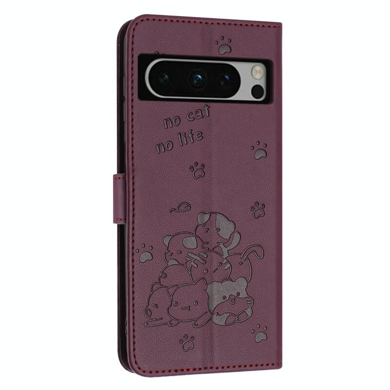 Θήκη δερμάτινη για Google Pixel 8 Pro με ανάγλυφο γατάκι και κορδόνι (Μωβ)